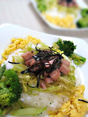- ご飯の上にお好きな野菜などをのせて、スクランブルエッグをのせて、スパムをのせて、焼き海苔をちらして出来上がりです。